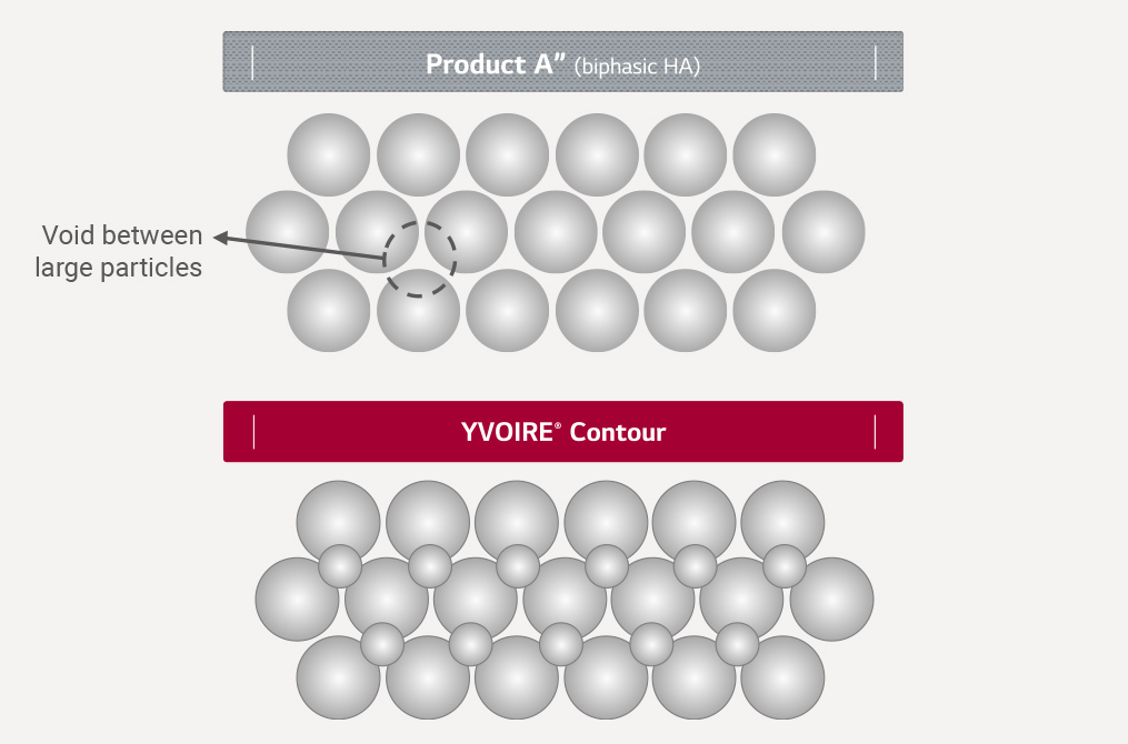 In HICE® cross-linking technology, small particles of cross-linked HA fill the void between the large main particles, resulting in smoother surface* on the correction areas and consistent smooth injection *Plast Reconstr Surg Glob Open 2020;8:e2648