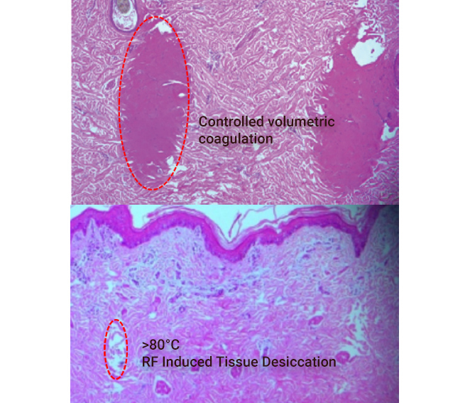 HIPR technology assures reaching 72 °C by adjusting energy inside the skin to overcome variable impedance. This forms large, equal coagulation zones and triggers mass collagen rebuilding rather than the partial collagen remodeling by an average of 55 ° using fixed energies.