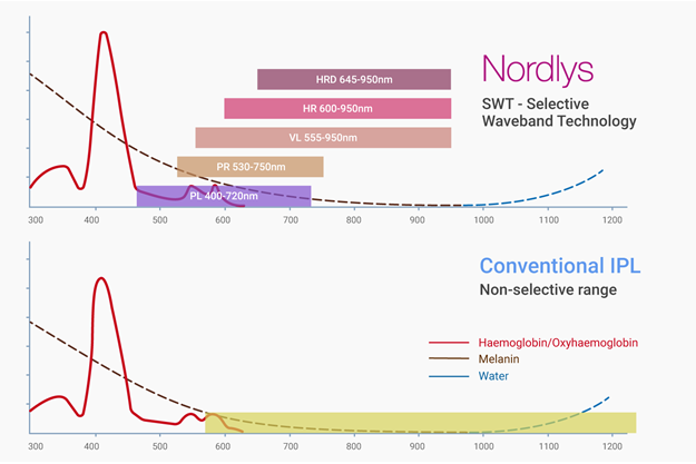 Historically IPL technologies offered a single range of wavelength (ex: 420-1200nm) and later the ability to filter wavelength from one end was introduced (ex: 550-1200).