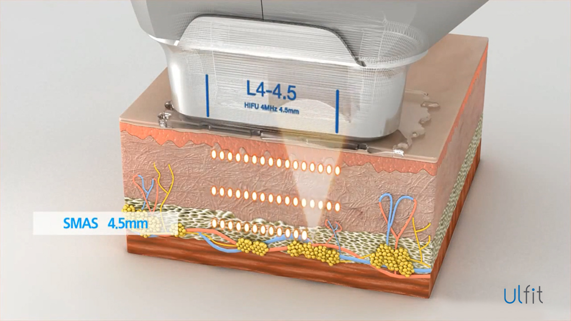 • The SMAS (Superficial muscular aponeurotic system) that connects facial muscles to the dermis by 4.5 mm cartridge, energy results in shrinkage of fibers and gives immediate impressions.